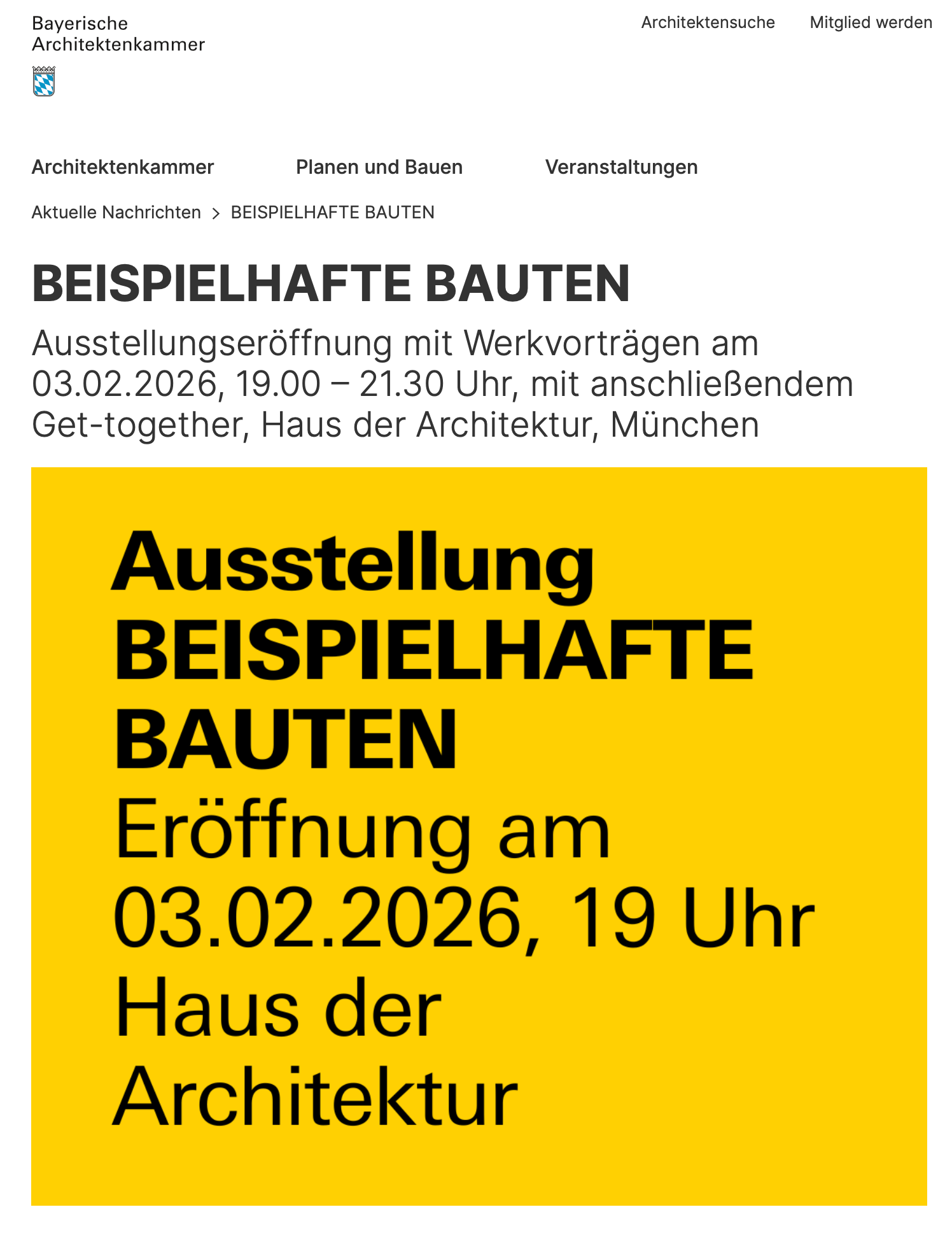 Die Ausstellung „BEISPIELHAFTE BAUTEN“ der Bayerischen Architektenkammer präsentiert herausragende Architekturprojekte, die hohe architektonische Qualität mit Energieeffizienz und Nachhaltigkeit verbinden. Die Initiative, unterstützt vom Bayerischen Bauministerium, zeigt gelungene Beispiele für zukunftsgerechtes Bauen im ganzen Freistaat.